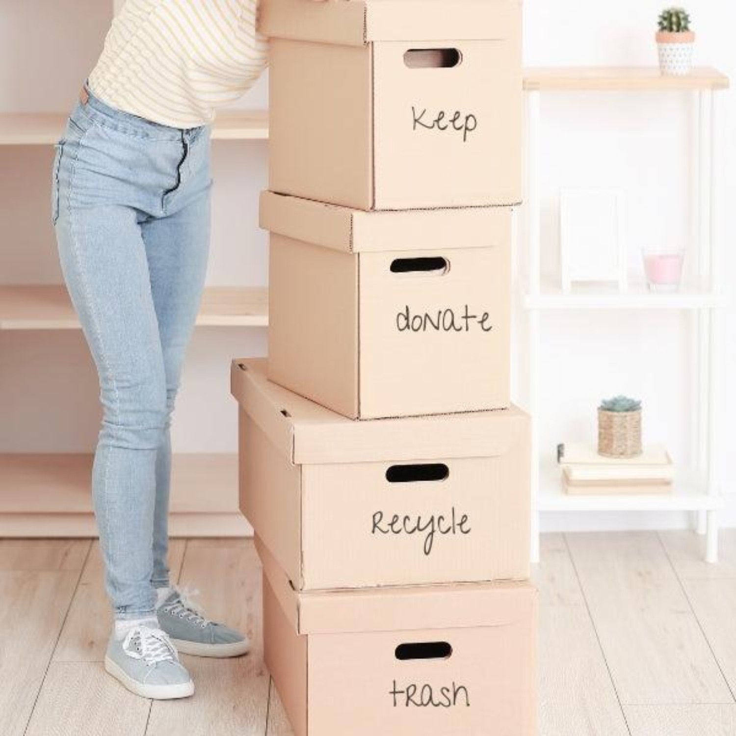 Set up four boxes (or areas) labeled Keep, Donate, Recycle and Trash. As you sort through items, assign each to one of these categories. Try not to get too sentimental—focus on keeping things that truly serve a purpose or brings you joy. Again, you might want to use a company to take the items to the recycling center or dump for you.