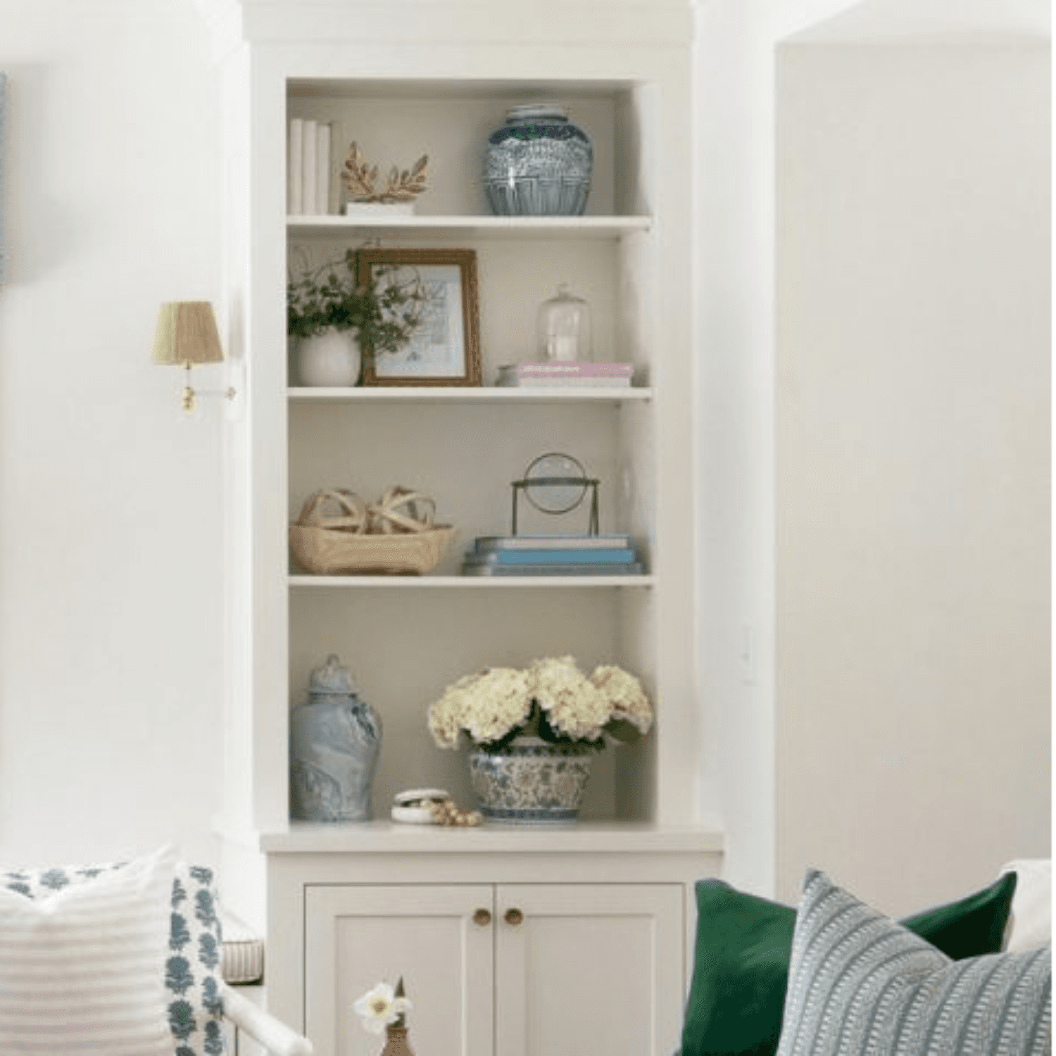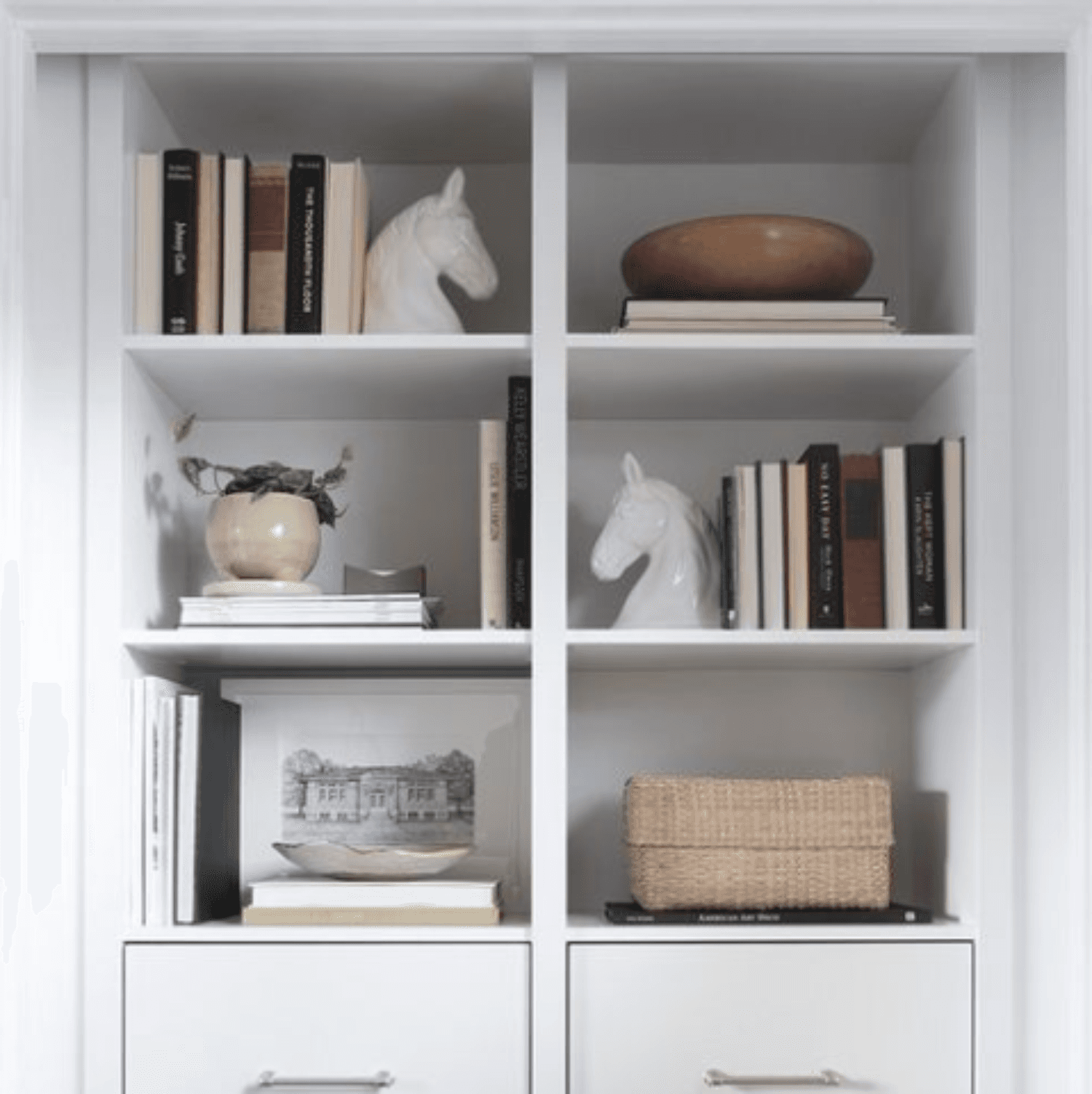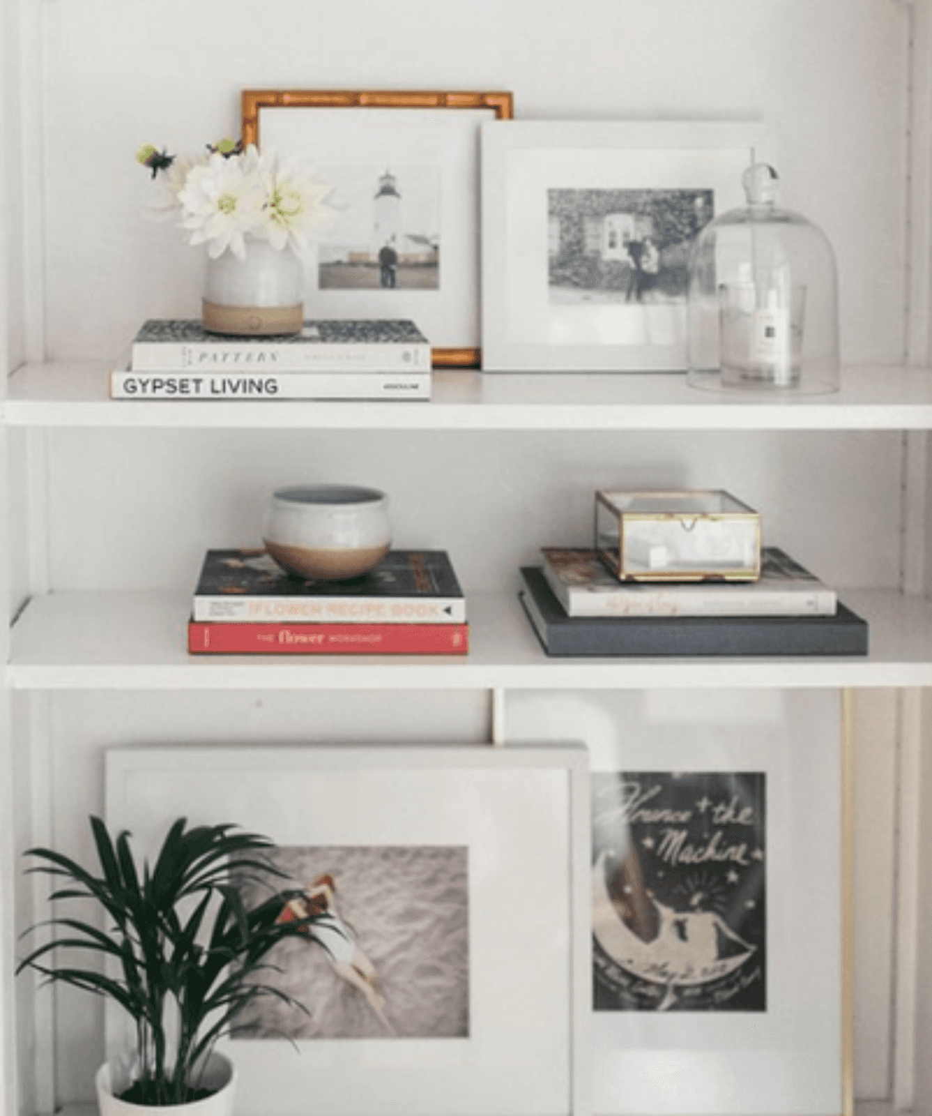 Over-styling your shelves will tire the eye and make your space feel cluttered. Leave areas of blank space between your vignettes to give the eye an opportunity to rest.