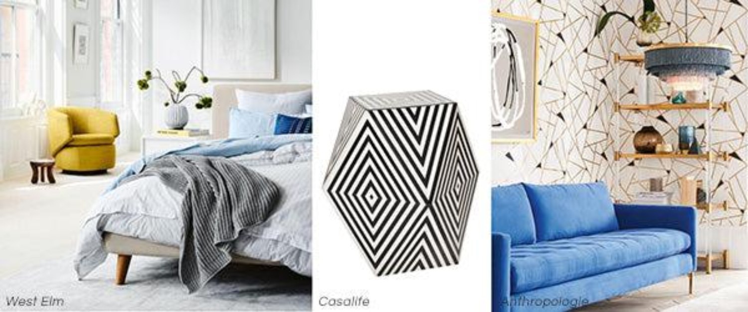 In terms of interior design trends, there's a strong influence of geometric play with little to no rules. Mirrored metallics, vibrant colours and 1970s lacquer have a retro vibe, but futuristic feel. Bold stripes, gridlines and triangles are also popular.