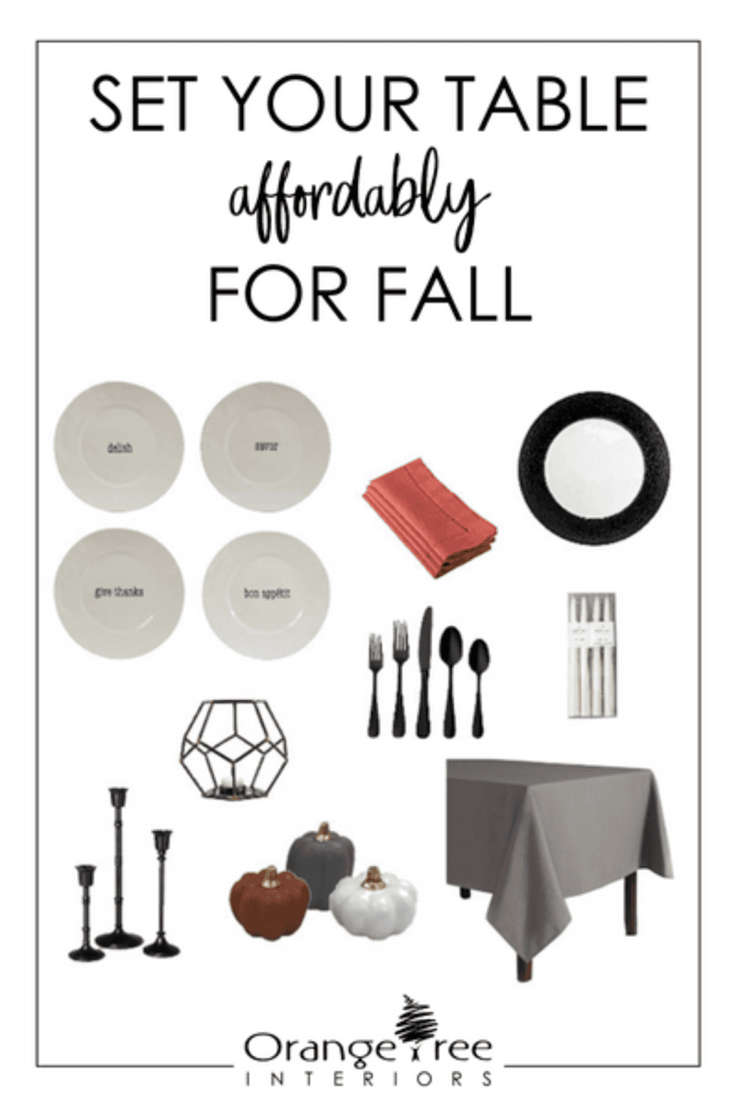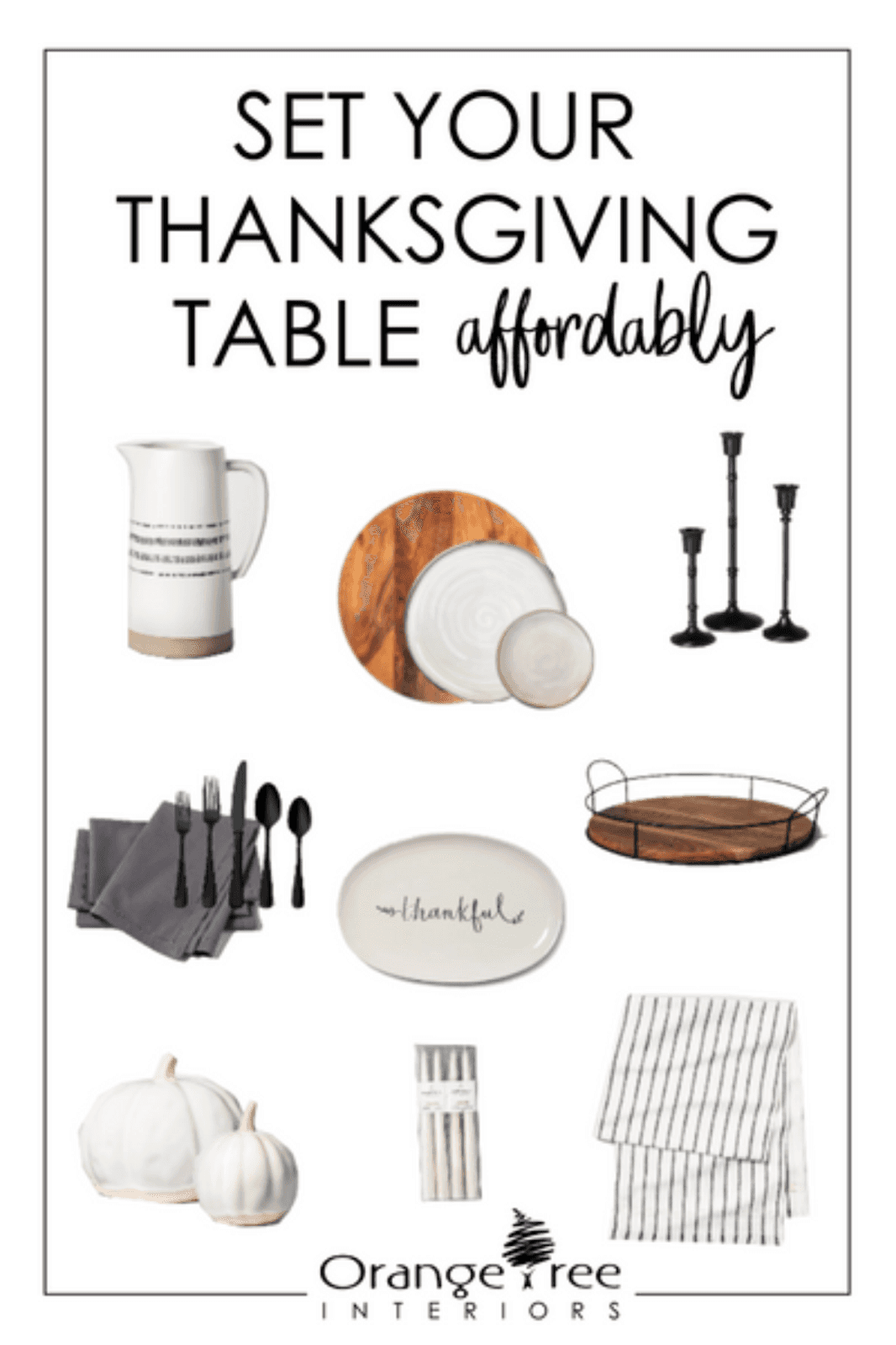 Water Pitcher | Wood Charger | Dinner Plate | Appetizer Plate | Candle Holder Set | Napkins | Silverware Set | Thankful Platter | Wood Tray | Large Pumpkin