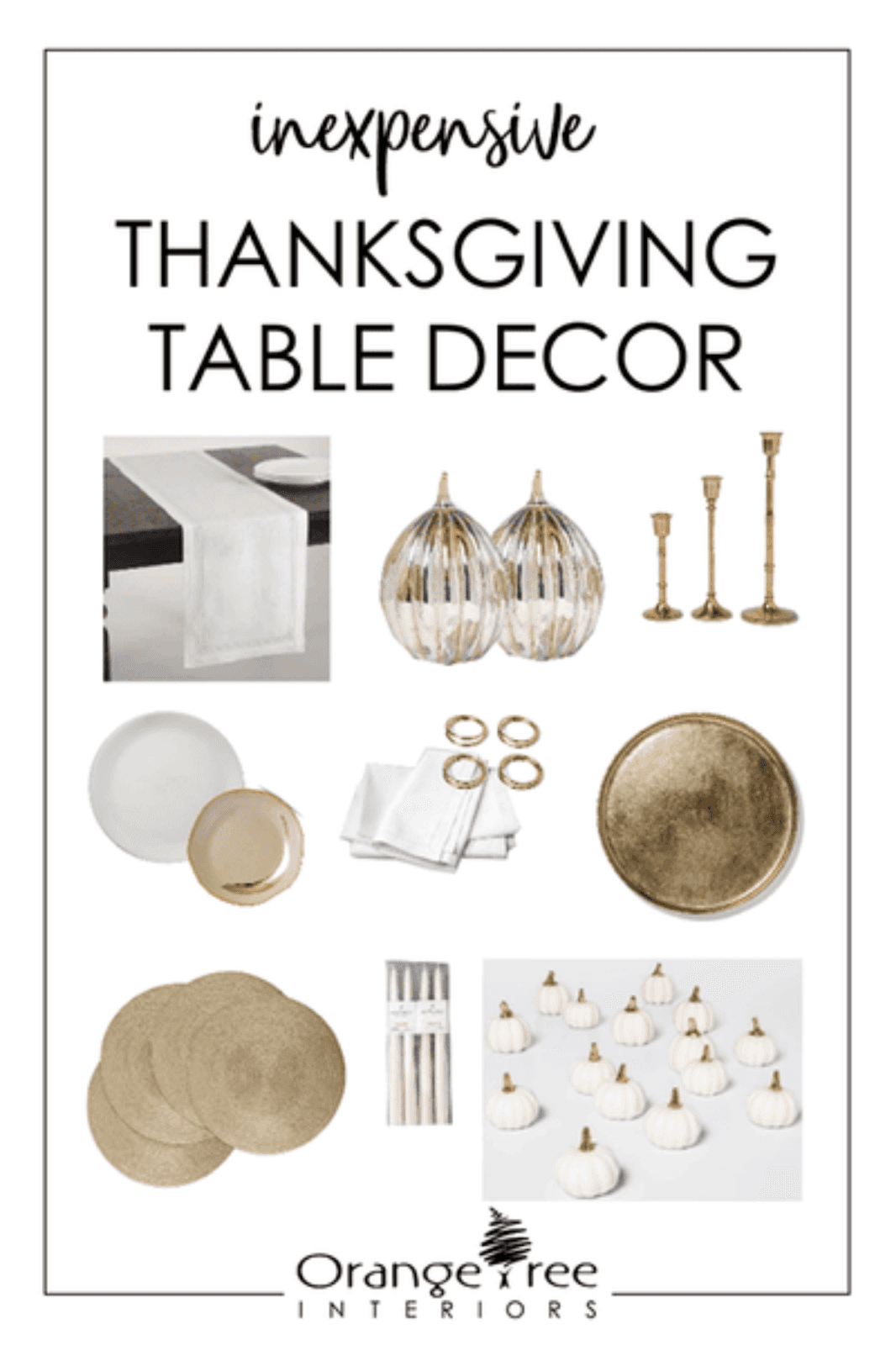 Table Runner | Pumpkins | Candle Holder Set | Dinner Plate | Dessert Plate | Napkins | Napkin Rings | Brass Tray | Gold Placemats | Candles | Mini Pumpkins