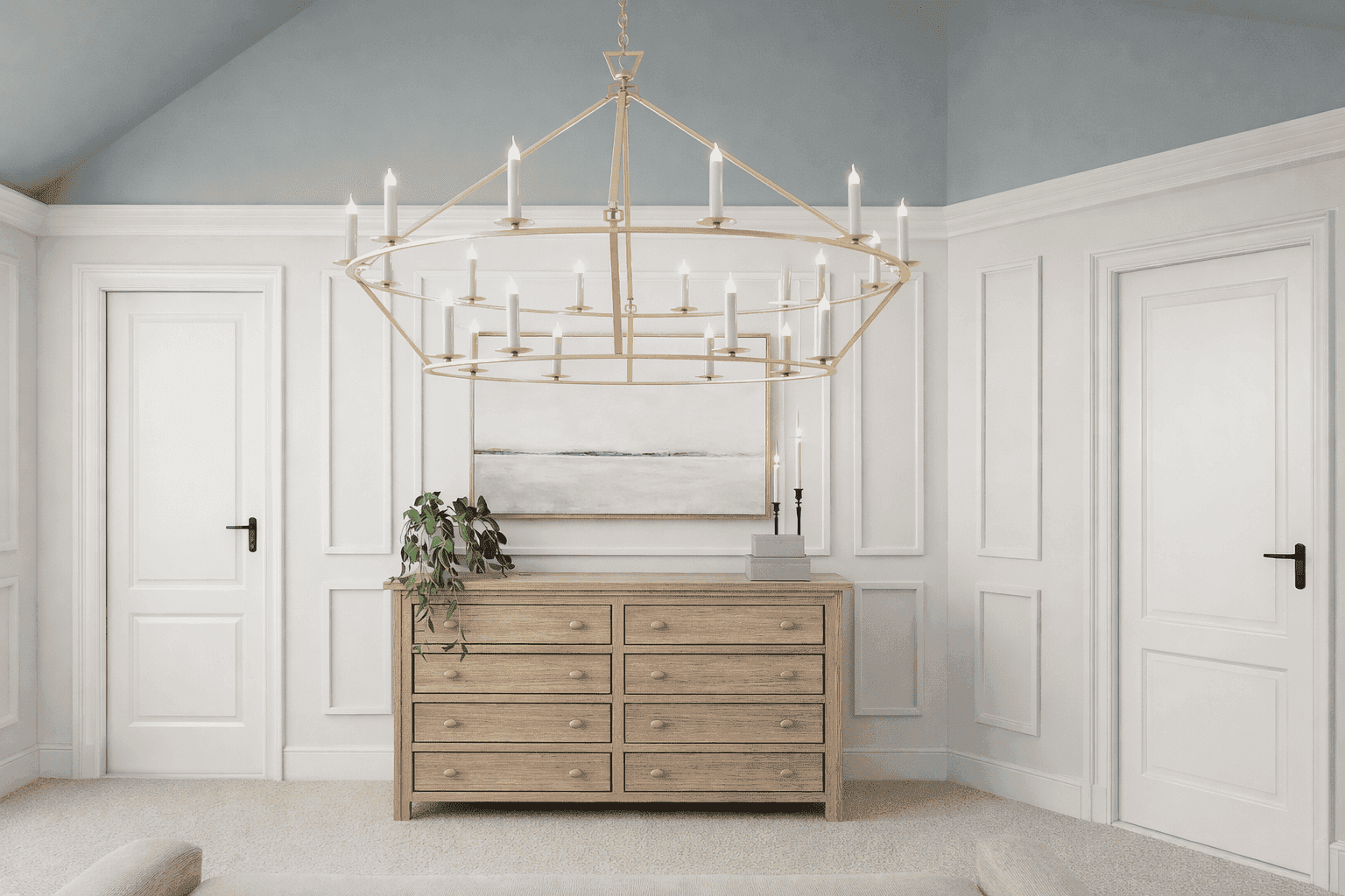 walls and chose a two-tier wood and gold chandelier that introduced elegance while