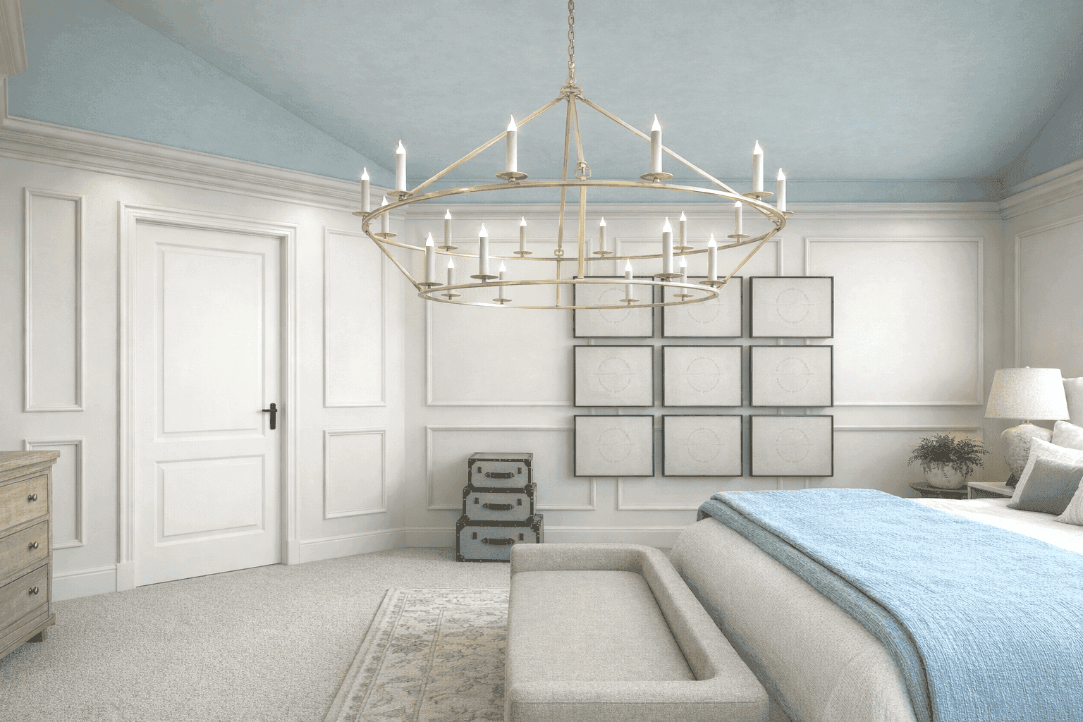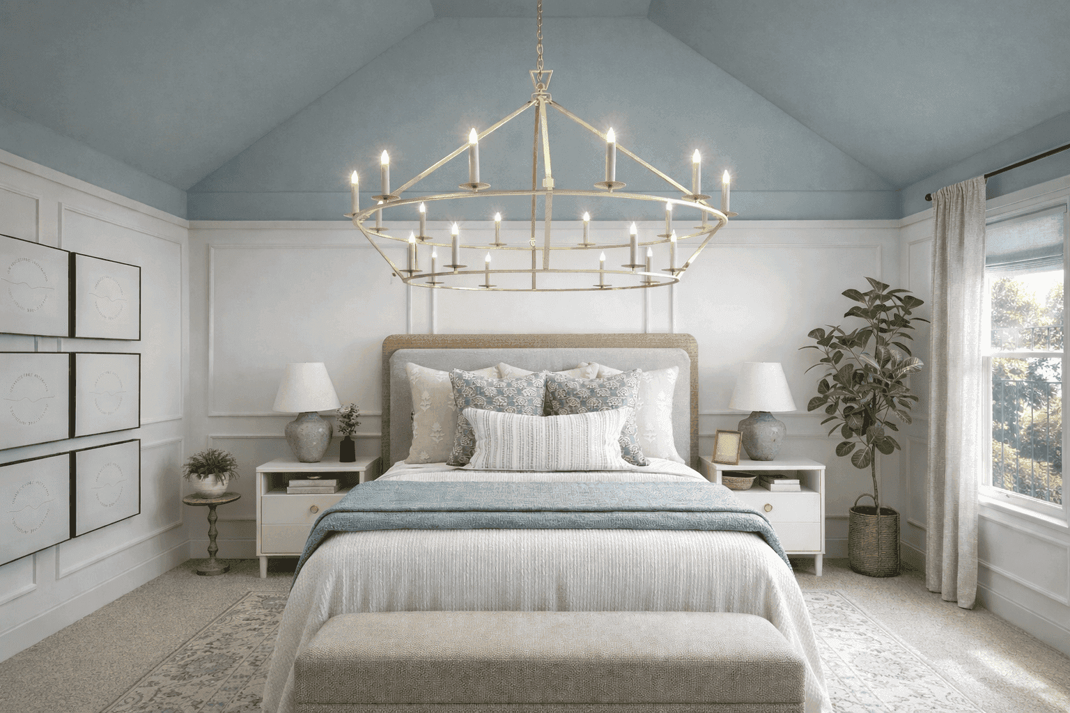 soothing blue-gray tone instead. This subtle shift visually lowers the height of the room, making
