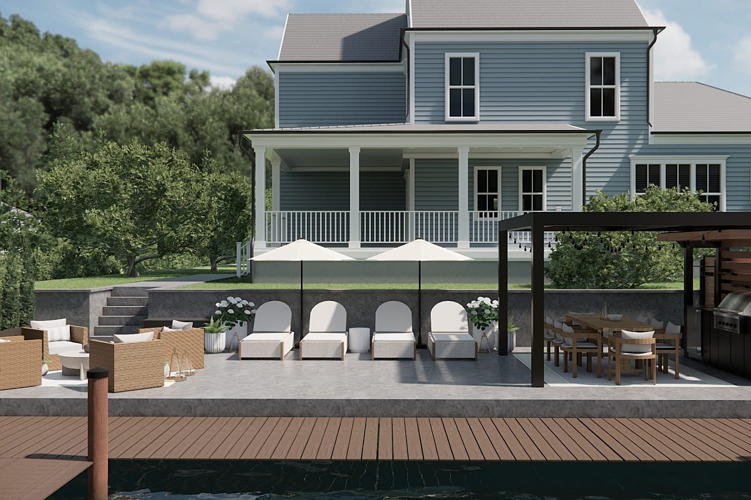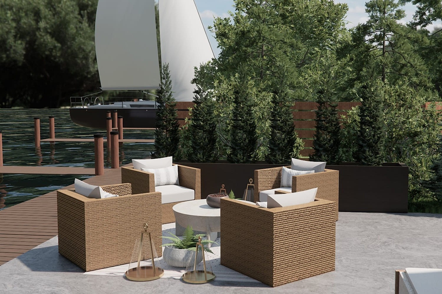 Neutral foundations work especially well outdoors because they feel timeless, adapt easily to seasonal changes, and allow the water, greenery, and sky to take center stage. We were lucky that these clients already had beautiful loungers to use as a starting point for the design. Subtle contrast through metal accents, soft blue textiles, and layered greenery add interest while maintaining a calm, resort-like atmosphere.