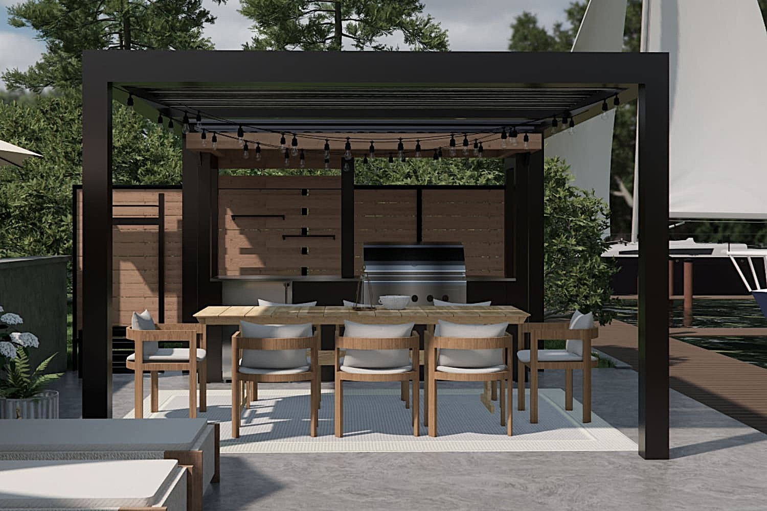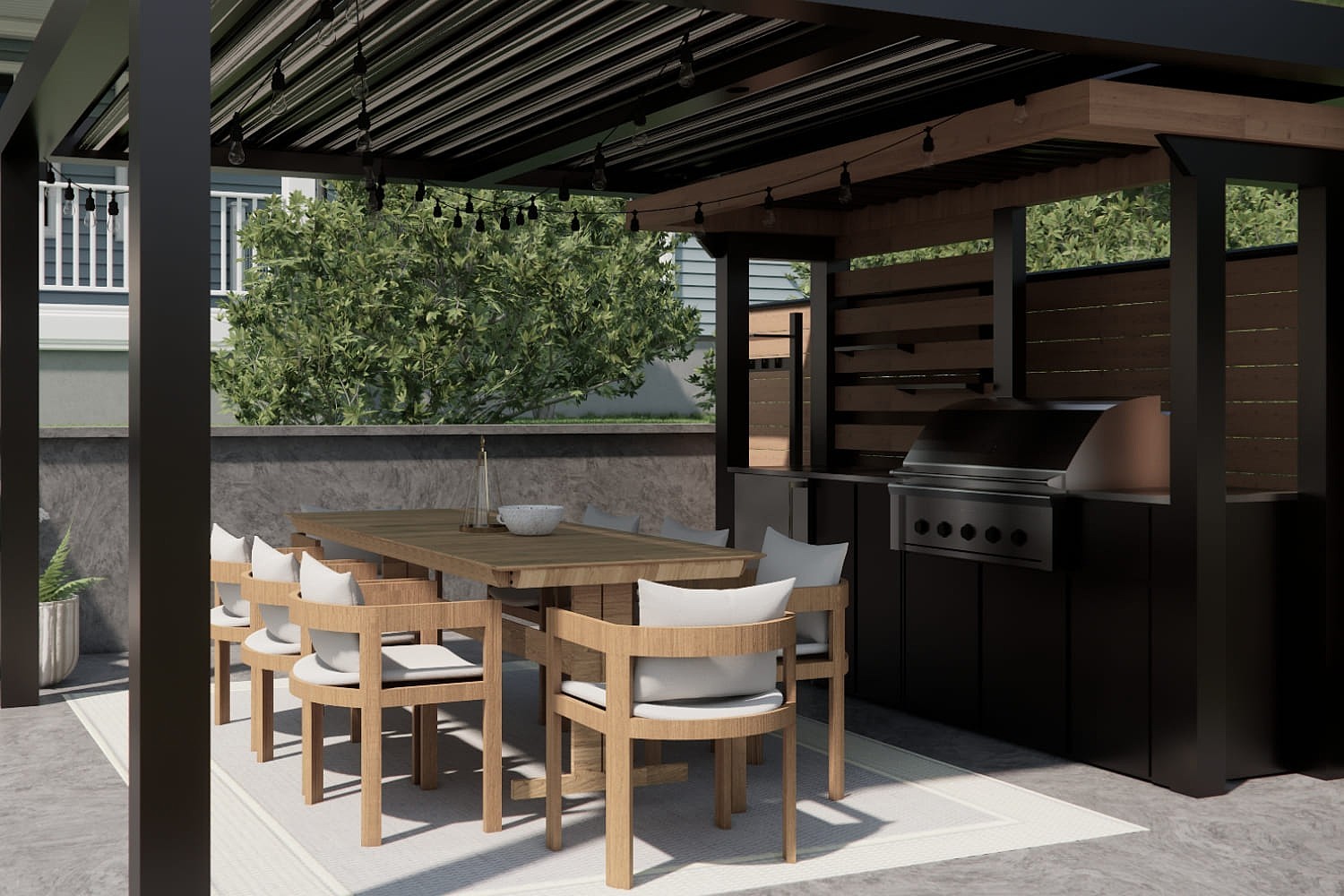 To increase usability and protect the furnishings, a slatted pergola was introduced over the dining and kitchen area. It adds structure and architectural interest while providing shade and shelter throughout the day.