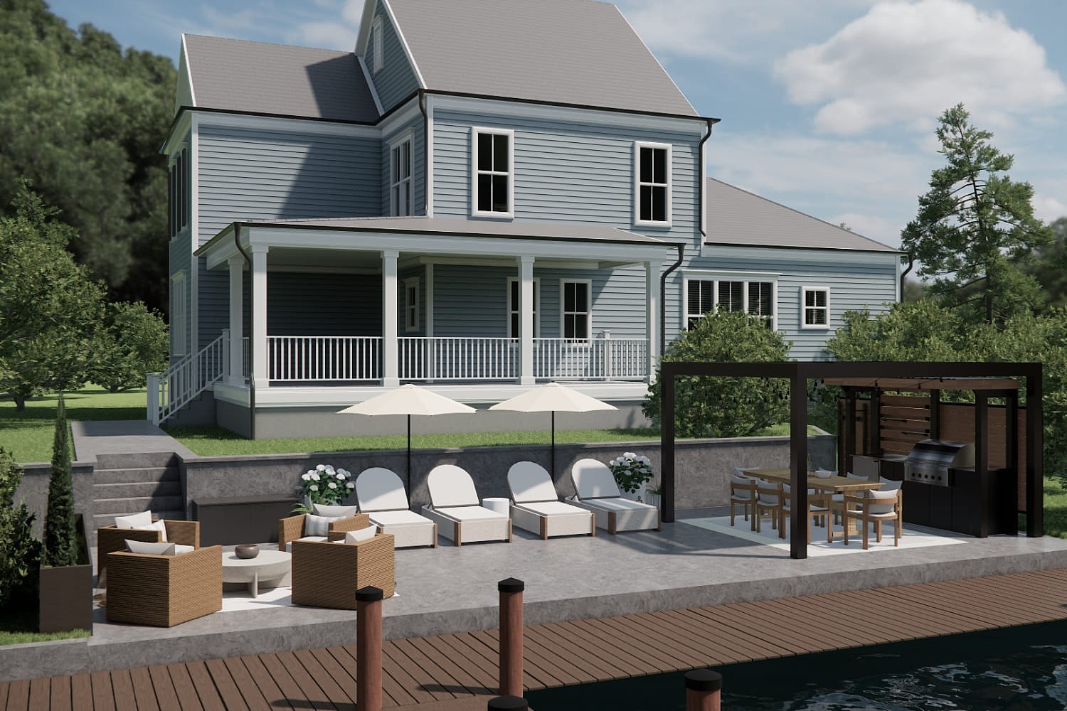 Every furniture selection was made with comfort, scale, and enjoyment in mind. Swivel lounge chairs allow guests to turn toward each other or toward the lake views. Deep, cushioned loungers invite rest and lingering afternoons. The expandable teak dining table supports both everyday meals and larger gatherings.