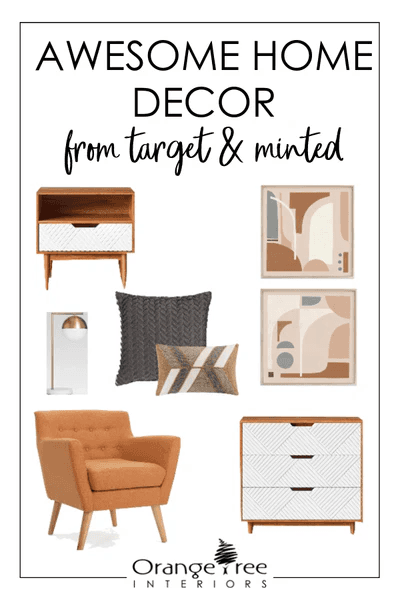 This midcentury modern inspired home decor is so playful with the pops of colour and youthful pieces. I thought the orange chair would be a great statement piece in a bedroom or as an accent chair in a family room. I love the geometric patterns on the nightstand and dresser - so retro! I personally, would place them in a tween or teenagers room. And how gorgeous is this globe table lamp? It has so much style it could practically stand alone. Use it on a nightstand, side table, console table or desk - it will work well in so many spaces. And how about that art? It works beautifully to tie the wood tones in the furniture and fabric choices in the textiles all together. LOVE it!