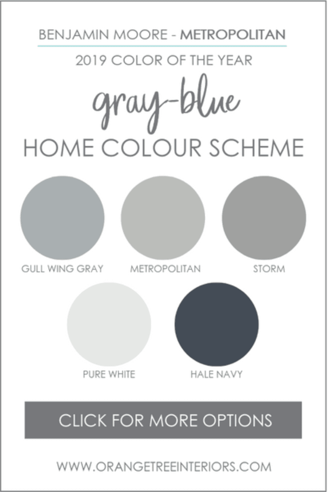 Before we dive in, let’s talk about the grey component in Benjamin Moore’s Metropolitan. Grey is calming, soothing and versatile. Grey is actually not a colour, but rather a mix of pure white and dramatic black. Because of its understated quality, it's considered a true neutral and pairs well with almost any colour. Therefore it can be used freely throughout your space. It offers the perfect backdrop for other colours to dominate and is especially popular in contemporary interiors. That being said, grey can feel depressing if too much of it is present. It’s important to balance it with other colours or use warm tones of grey to make it more comforting. These paint colour schemes will do just that.