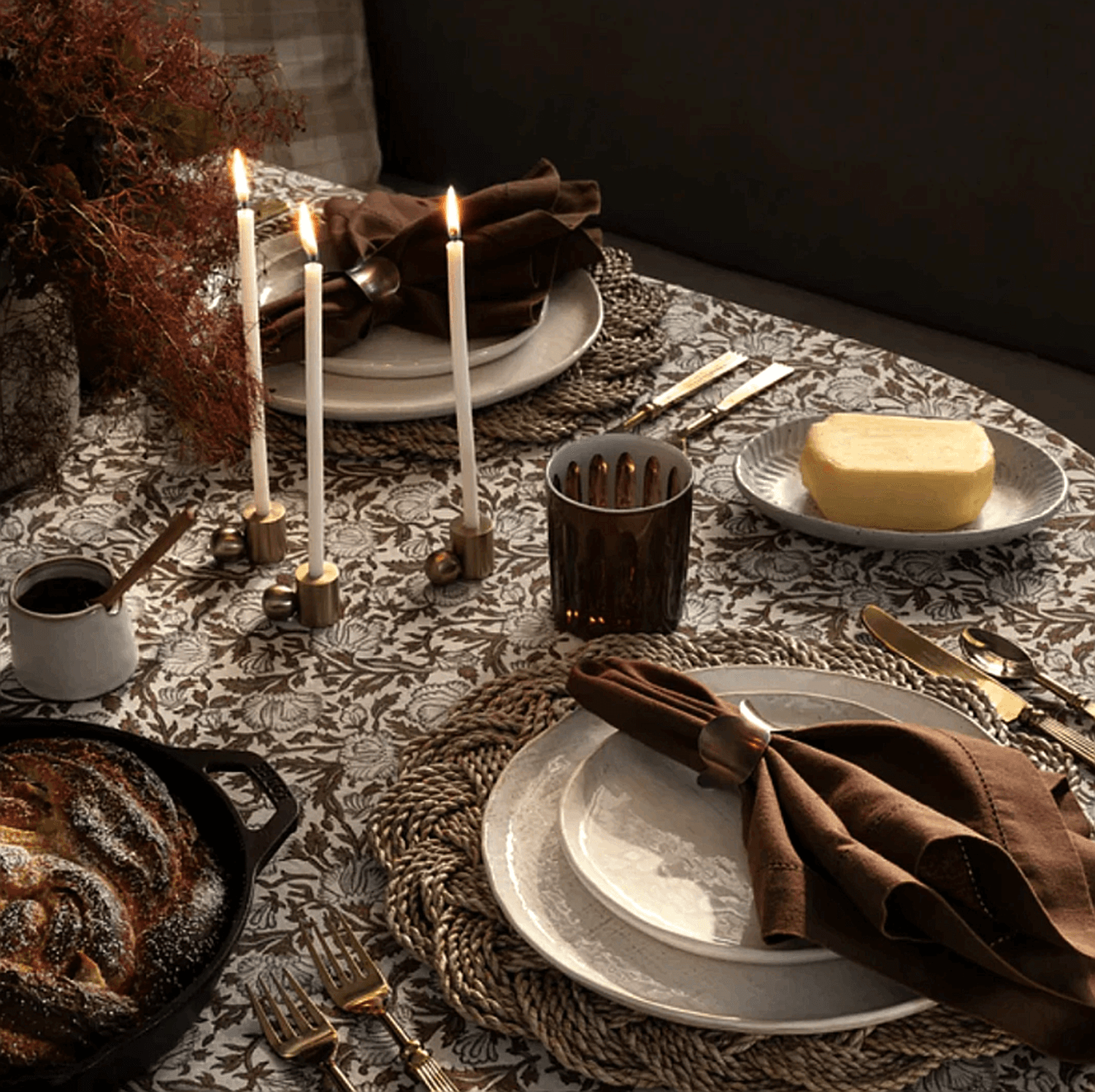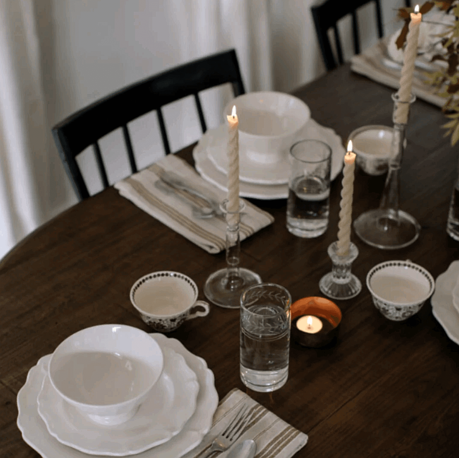 Lighting is one of the quickest ways to set the mood. Candles (tapers or votives) are my go-tos, but you can also add lanterns, hurricanes or fairy lights to your tablescape. If you have sconces or overhead lighting, dim the lights to create a warm glow that feels cozy and inviting.
