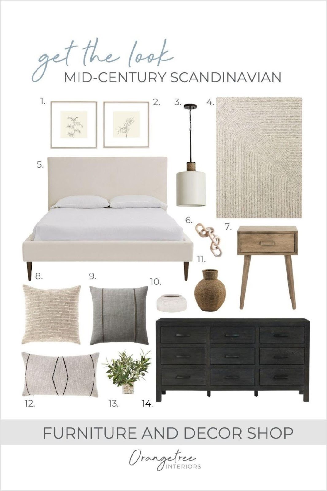The bedroom I chose to design is a mix of mid-century modern and scandinavian styles. I used natural linen material for the bedding and a mix of patterns and textures to create depth within the design. Keeping in line with Scandinavian design, I went with a lighter wood tone nightstand and a minimalistic pendant with a small wooden accent to create repetition in the space and thus make it cohesive. Lastly, the dark-stained wooden chest drawer not only added interest to the space but also contrasted well with the other pieces."