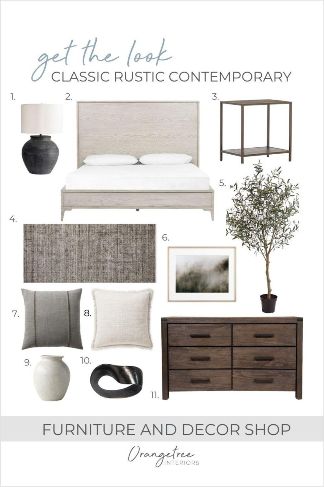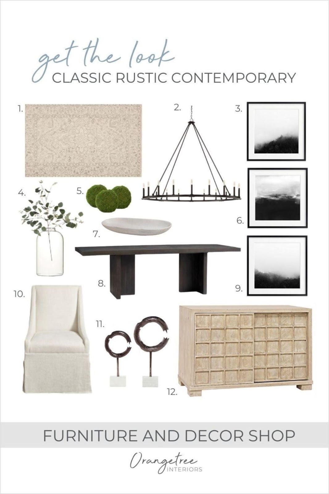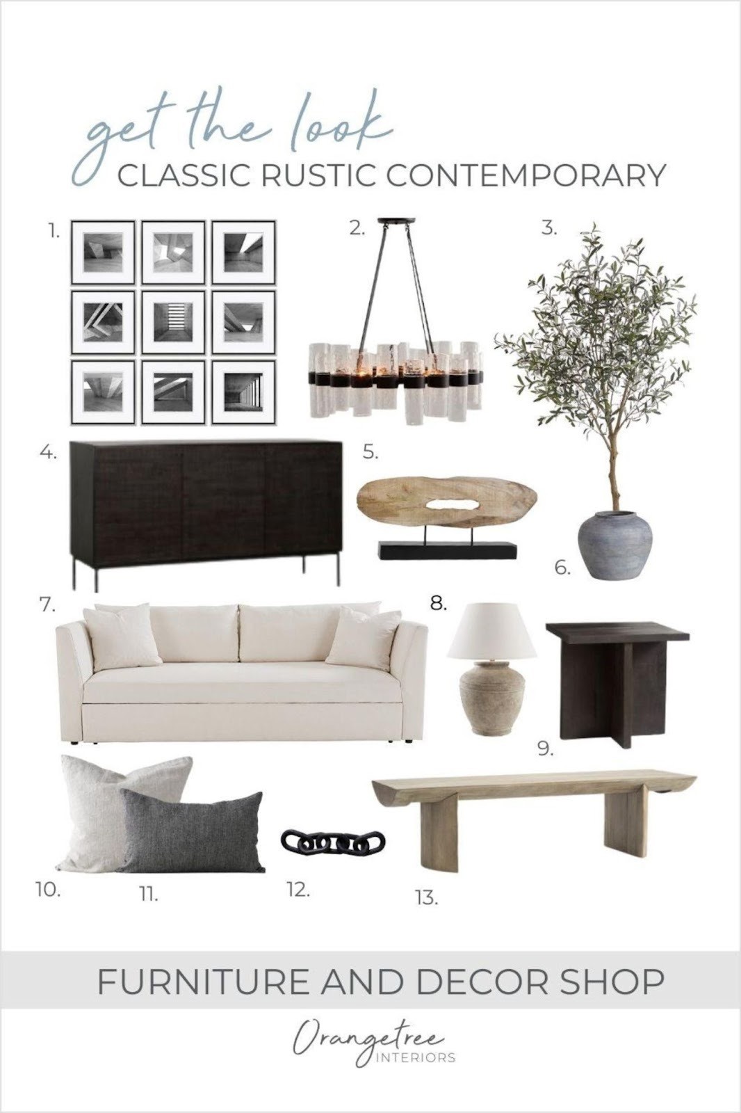 In the living room that I put together using some of my favourite items from our shop, I was heavily influenced by Restoration Hardware and the luxe, neutral, earthy feeling that their company remains true to. I used a neutral colour palette and used contemporary shapes with the sofa, sideboard (which could be used as a media console), light fixture and side table. I love the coffee table as it brings in a rustic and reclaimed element to the space and contrasts the dark colours in the rest of the space! Also, the faux olive tree is one of my favourite elements because it brings in colour and an earthy element!