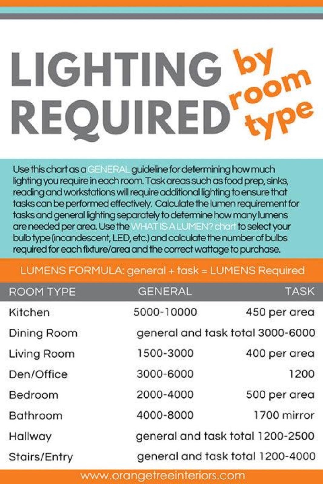 Next, pinpoint the number Lumens that are generally used to light that particular room type (refer to LIGHTING REQUIRED chart below)