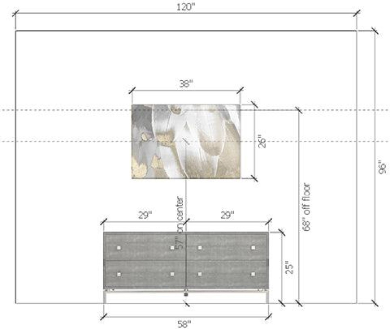 Art over furniture should be centered horizontally over the furniture. Here’s an example using a 58”W dresser to better explain the scenario.