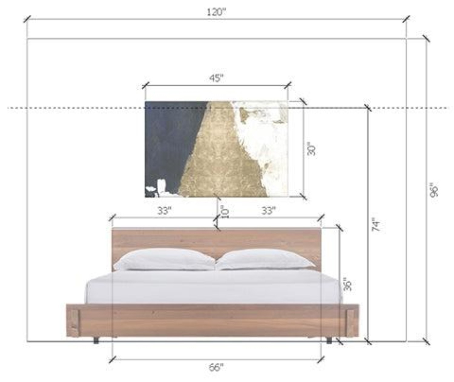 Typically a bed is the focal point of a bedroom. Therefore, it’s best to highlight it with art if the headboard isn’t dramatic enough. When hanging art above a bed, it’s best to hang it so that the bottom of the art or frame lies 8-10” above the top of the headboard. A larger gap can make the art feel disconnected from the bed. Here is an example using a 36”H headboard and a 45”W x 30”H piece of art to better explain the scenario.