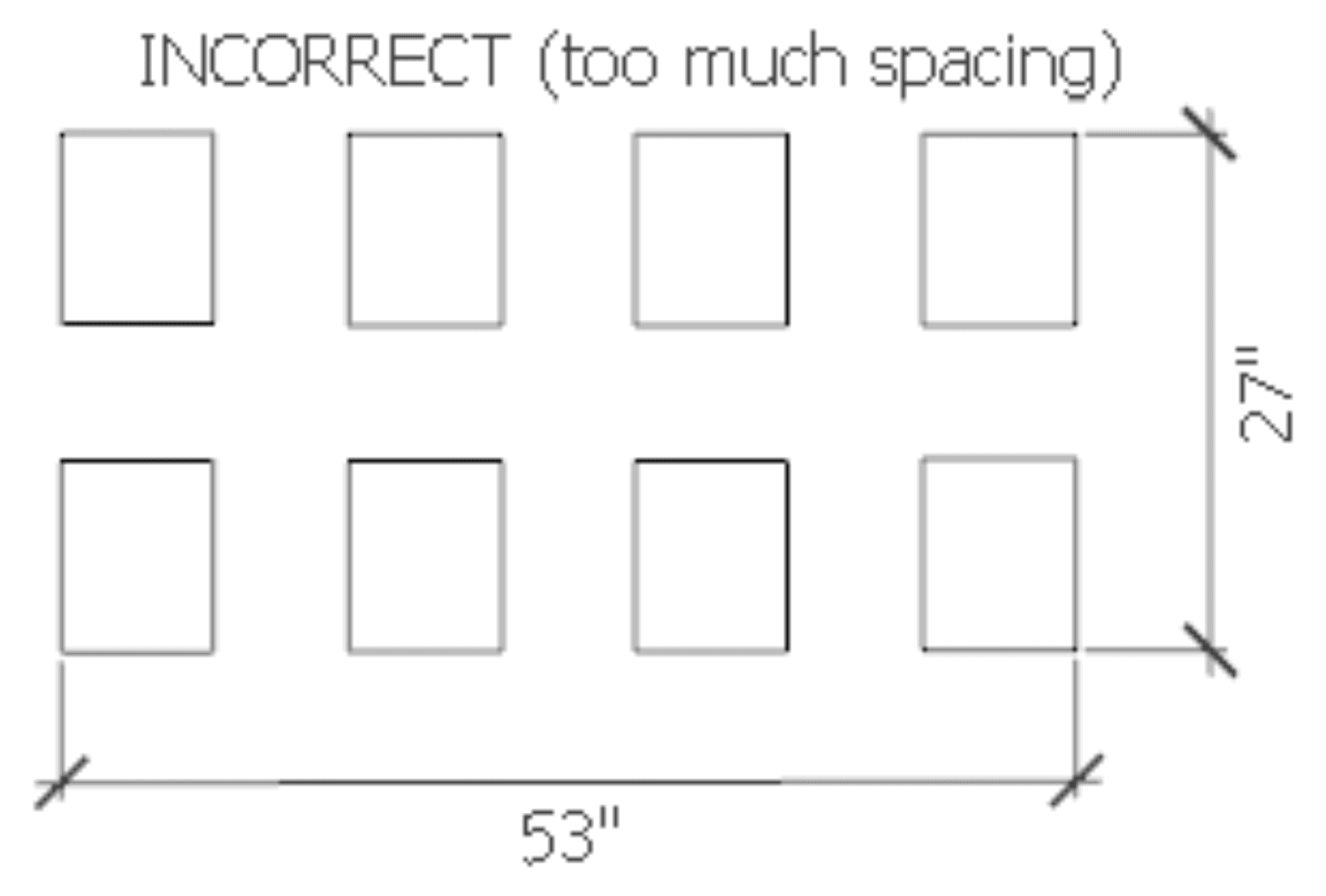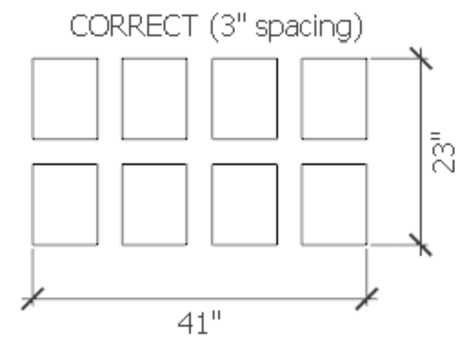 The above rules apply to groups of art as well. When hanging more than one piece together, think of each piece as part of a group. Then think of the group as ONE piece of art. When arranging each piece of art, make sure not to exceed 6” of space between each item; doing so will make the group feel disconnected. Instead opt for a 2-3” gap of space between items to ensure they feel like they belong together. See the following example using eight pieces of art that are 8”W x 10”H each and hung in two rows and four columns.
