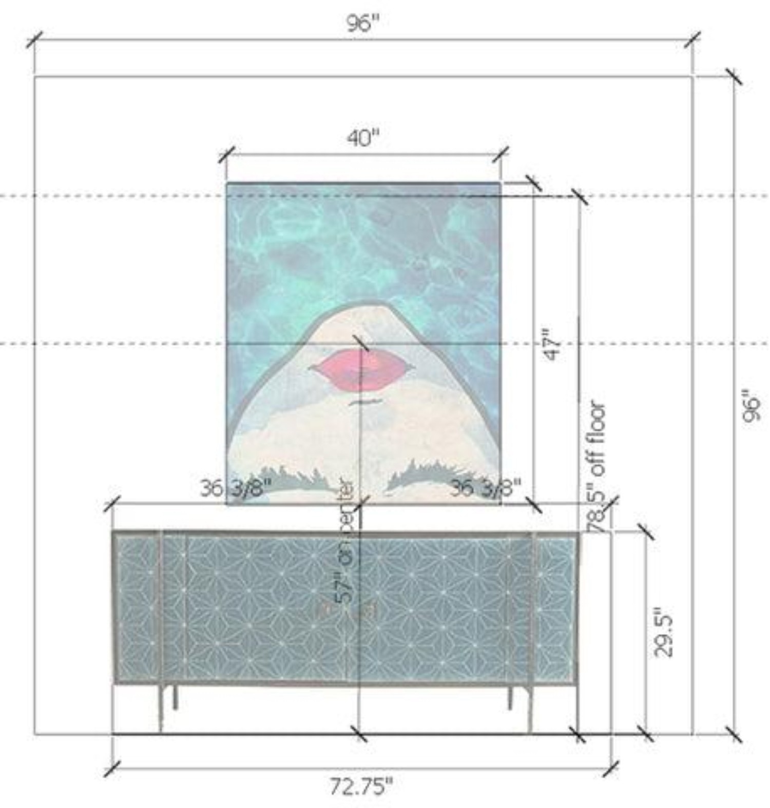 Always remember the phrase; 57” on center. What does 57” on center mean? It means that art should be hung so that its center is viewed at 57” off the floor. See the following example using a 47”H x 40”W piece of art to better explain the scenario.