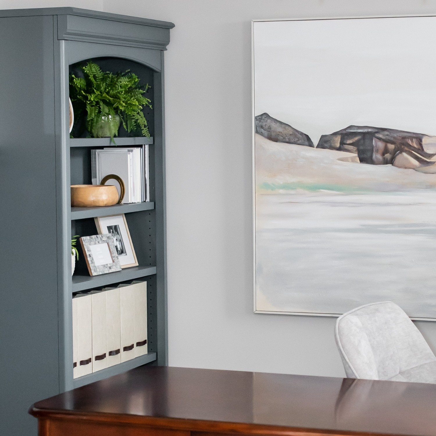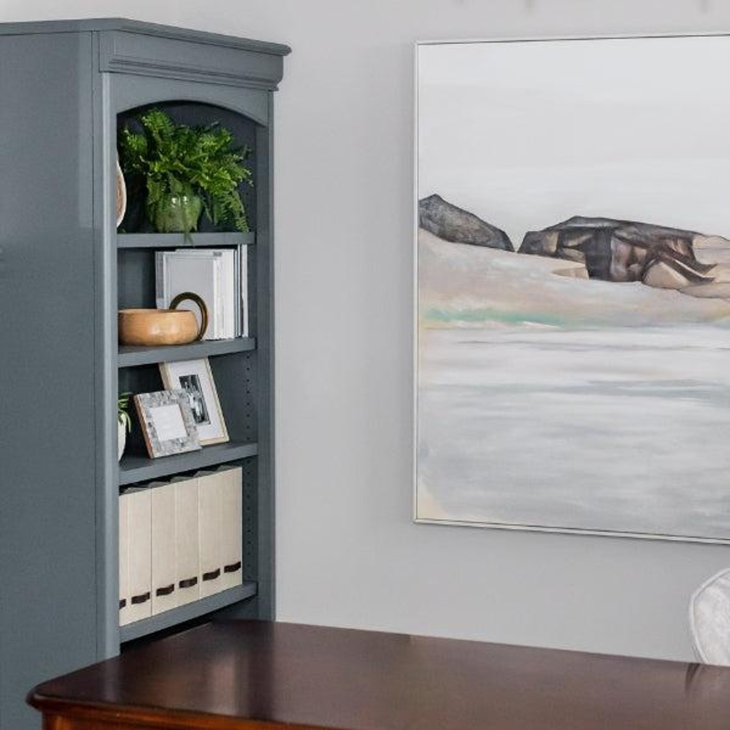 A deep, moody blue-green-gray that adds richness and sophistication to your coastal paint color palette. I love using Grays Harbor on built-ins, cabinetry, or accent walls where a little drama still feels calm and grounded - especially when paired with white or natural wood tones.