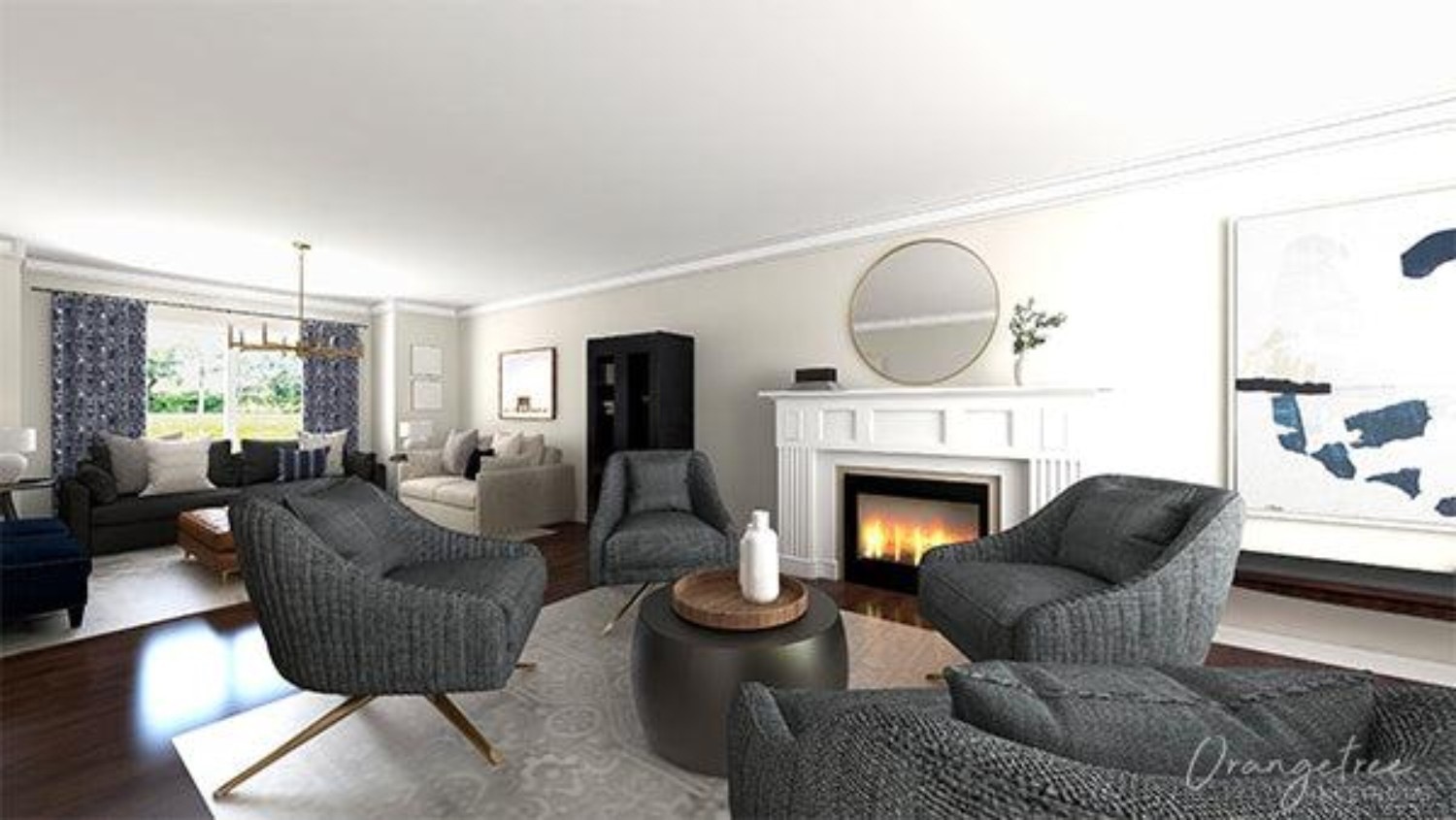 Next, we created the entertaining zone in front of the fireplace. With four swivel chairs facing each other and positioned around a coffee table, this was the perfect conversational space to enjoy drinks & applies with friends.