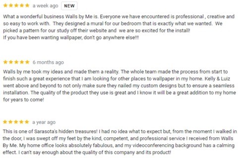 They love the fact that they are acquiring a wallpaper product locally (Sarasota, FL) from a local company that they can browse online but also go in-person and touch and see the material, talk to real people, and have the peace of mind that they know they are buying from a local company a high-quality product.