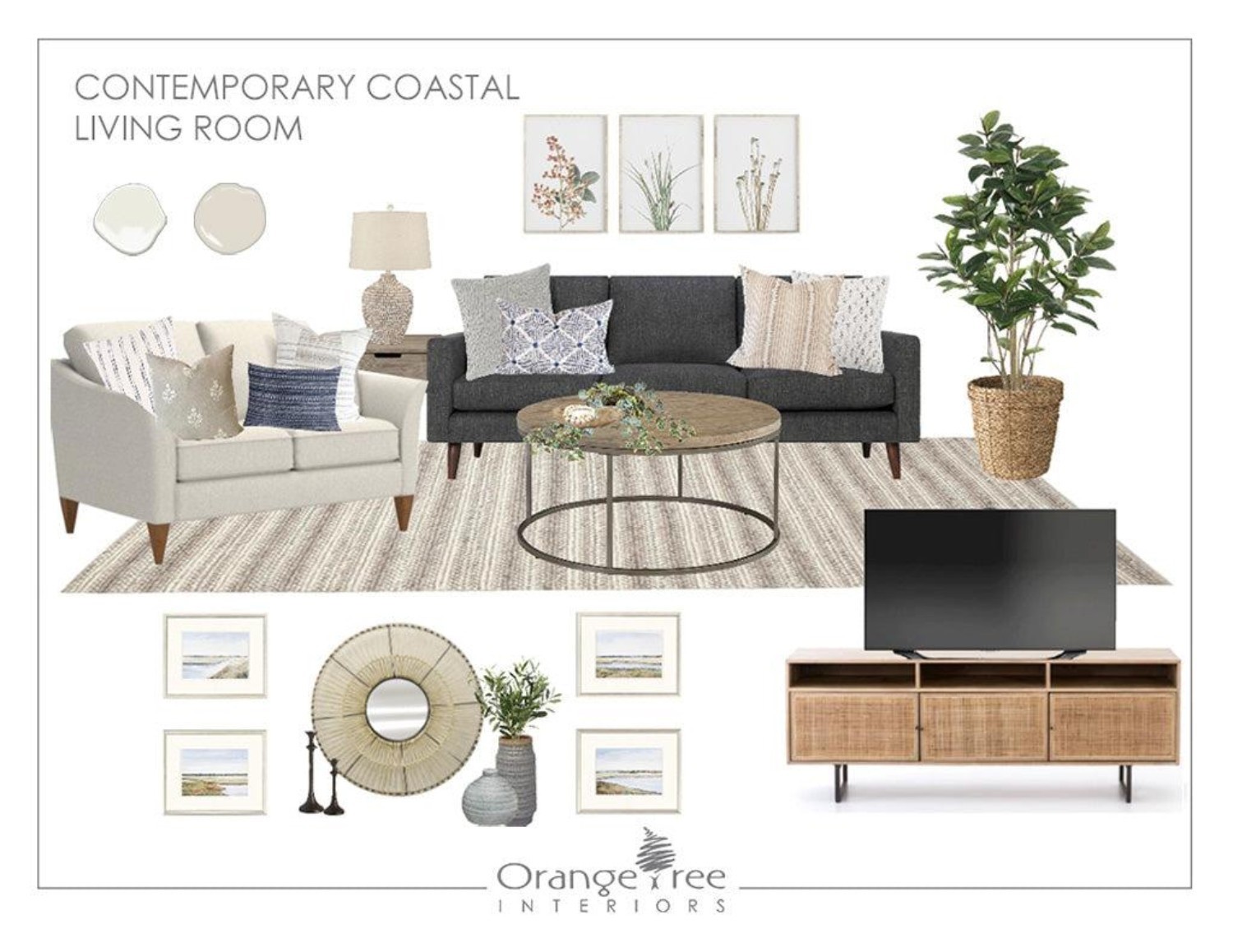 This concept design was developed for clients that wanted to brighten their dark wood filled home. Although their home was in great condition, the dark wood tones in the flooring and cabinetry made the space feel heavy. The clients expressed a love for coastal-inspired interiors so we incorporated a bright, light colour palette and paired it with some heavier textures to stay in keeping with the climate here in Canada. This living room design was a full overhaul that was super fun to work on.