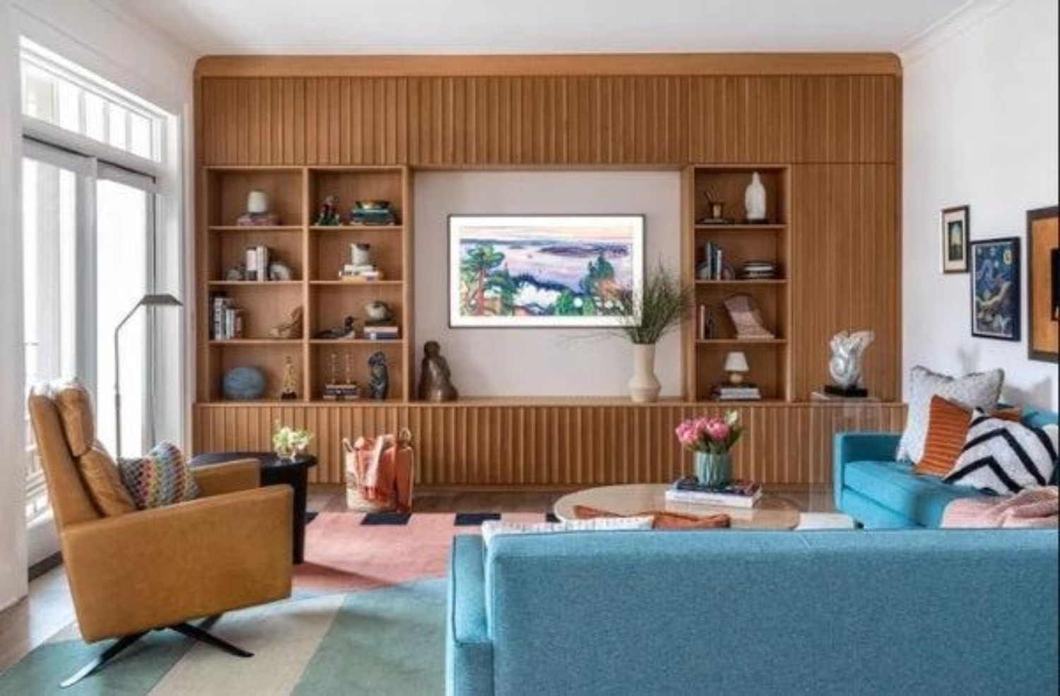 To perfectly balance this warmth and coolness, consider using the cooler colour as a base. As an example, you can use teal or blue for larger pieces such as the sofa or a gallery wall where you can hang your favourite contemporary art pieces and posters. You can then introduce coral through pillows, ottomans, rugs or the art pieces themselves, while yellow-gold might appear in smaller accents like vases, sculptural objects, floor lamps or picture frames. This combination keeps the room feeling balanced by offsetting the coolness of teal with the warmth of coral and yellow.