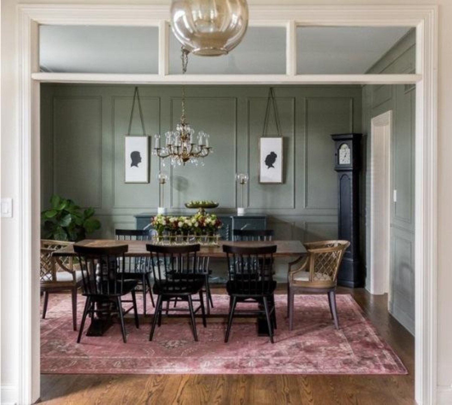Using a split-complementary scheme in the dining room can make the space more elegant yet welcoming. For instance, if your base colour is burgundy, its split-complementary colours are blue-green and yellow-green. Burgundy can be used for an inspiration piece like a beautiful rug or artwork or more significant areas such as an accent wall, while blue-green and yellow-green can be showcased in furniture or other items like linens and centerpieces, plants and flowers or serveware.