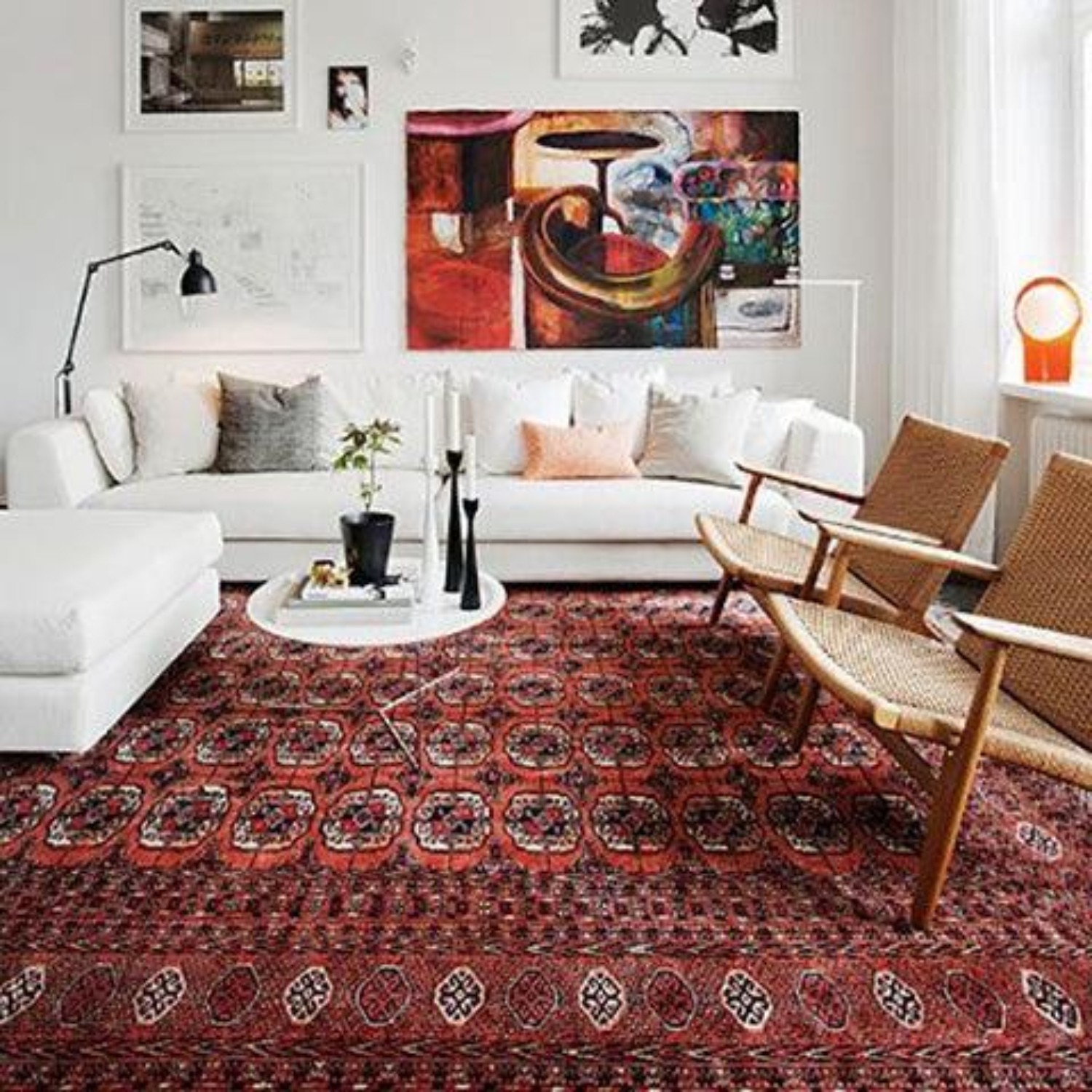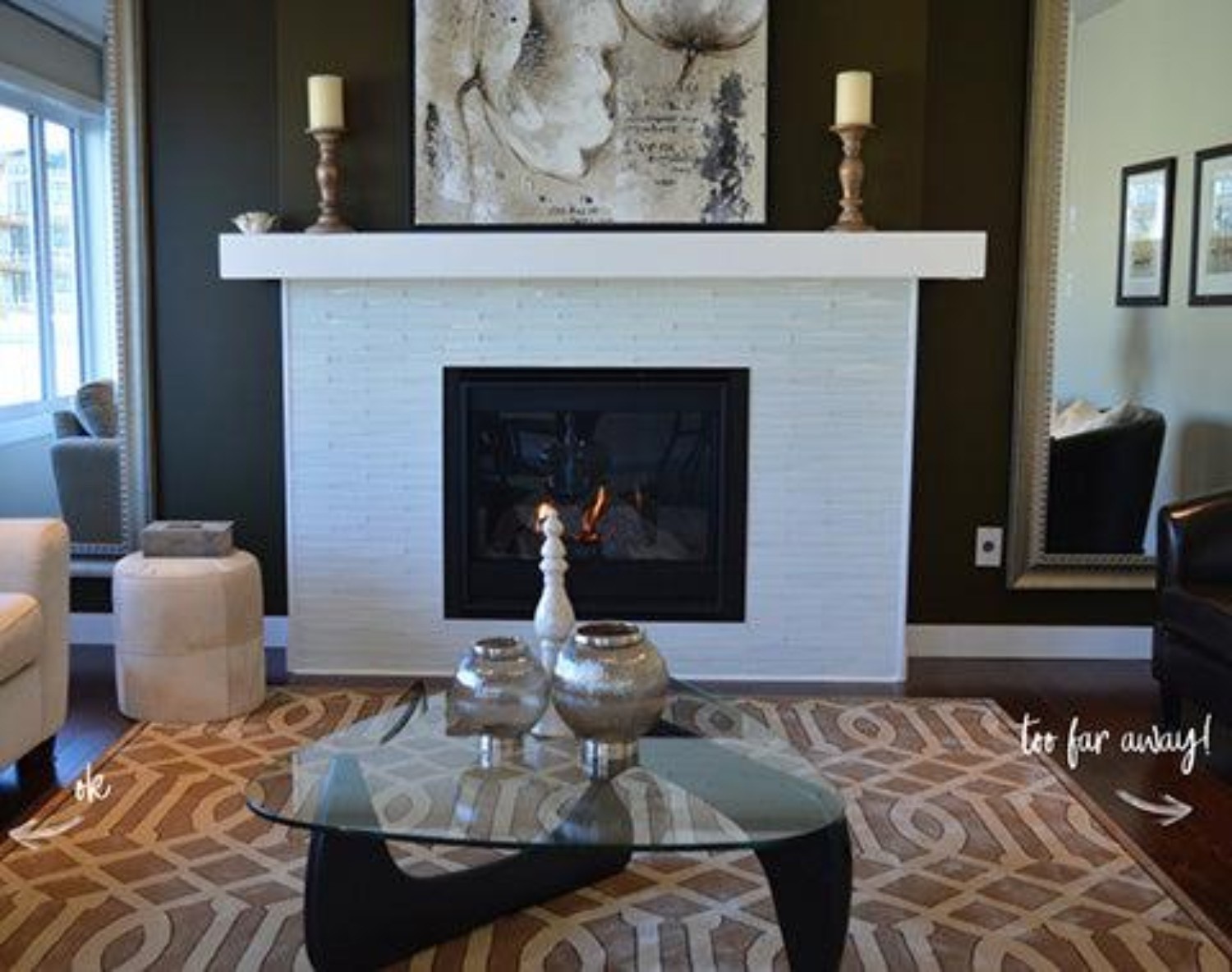 At the bare minimum, an area rug should never be more than 6” away from any main piece of furniture. If it is, then it’s too small. Some people may be tempted to purchase an inadequately sized area rug because rugs can get expensive, but it really does a disservice to the overall design of a space. Size it right and your area rug will help make a statement by framing out the design.