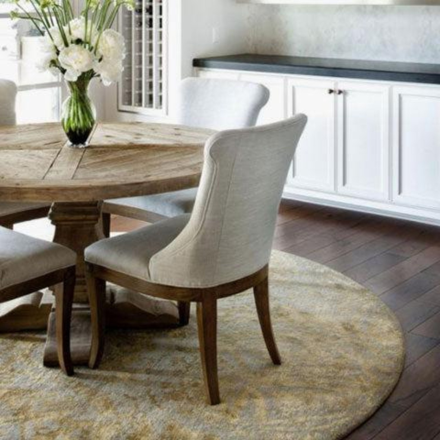 For square and round tables add 48” – 72” to the size of the table to calculate what size area rug is needed.