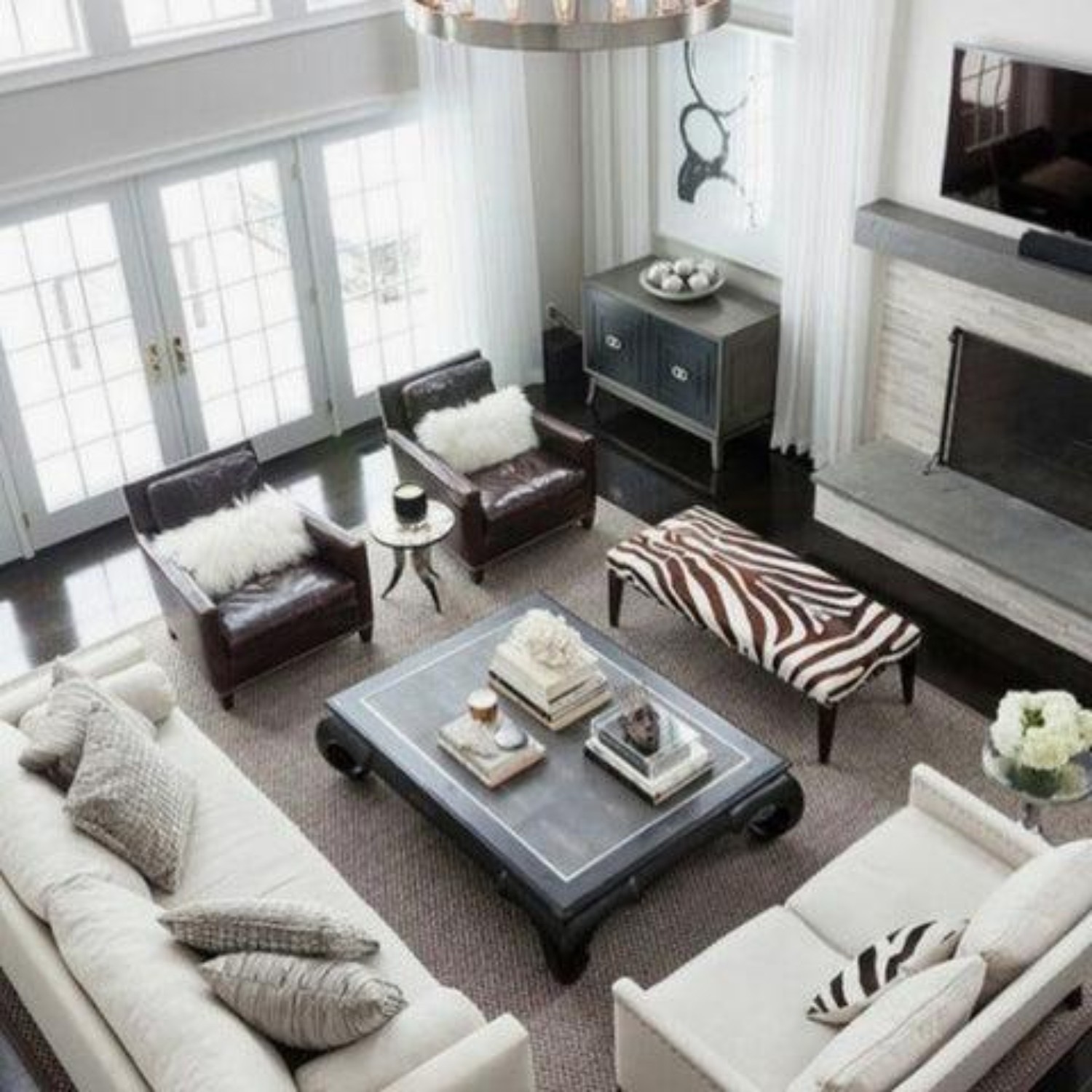 Large living room (15’ x 20+’) – likely two area rugs will be needed to define separate seating areas. Use the guidelines above to determine the size for each space.