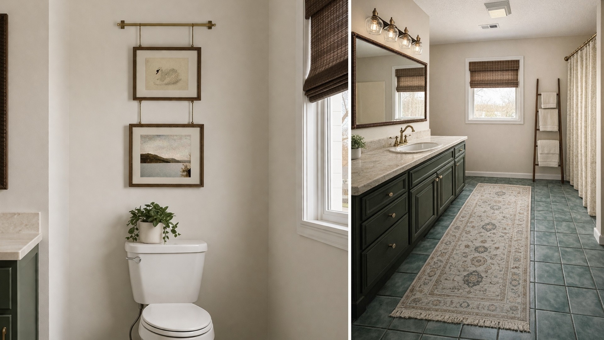 To make the blue-green tile feel intentional, we’re incorporating textiles and art that include a mix of beige, ivory, green, and hints of blue-green. We’ll add a runner on the floor, a shower curtain with complementary tones, and two pieces of art above the toilet that echo those colors. This layered approach makes the tile feel like a deliberate design choice